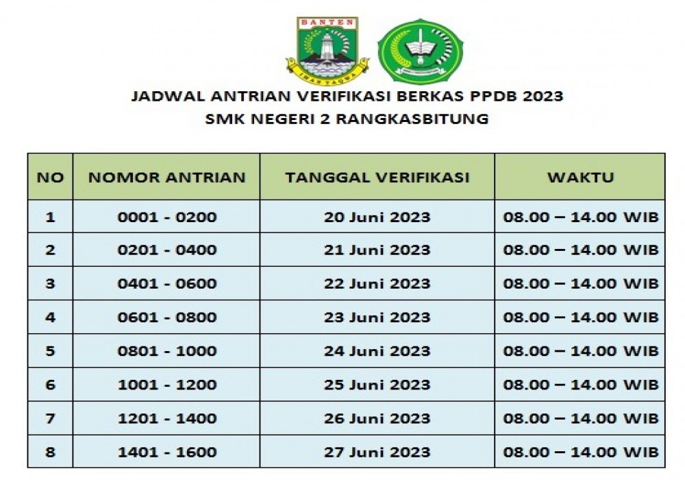 Hallo adik adik calon peserta didik baru,, SMP/MTs admin informasikan bahwa Jadwal antrian di verifikasi SMK Negeri 2 Rangkasbitung, akan segera di buka dan dimulai Tanggal 20 Juni 2023 sampai dengan 27 Juni 2023,,