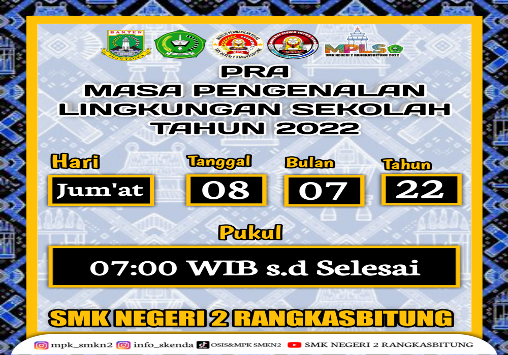Hallo,,, adik adik selamat bagi peserta didik yang telah DITERIMA langkah selanjutnya silahkan untuk mengikuti kegiatan PRA MPLS ( Masa Pengenalan Lingkungan Sekolah ) Tahun 2022 terhitung dari Hari Jumat Tanggal 08 Juli 2022, Pukul 07:00 s.d Selesai.